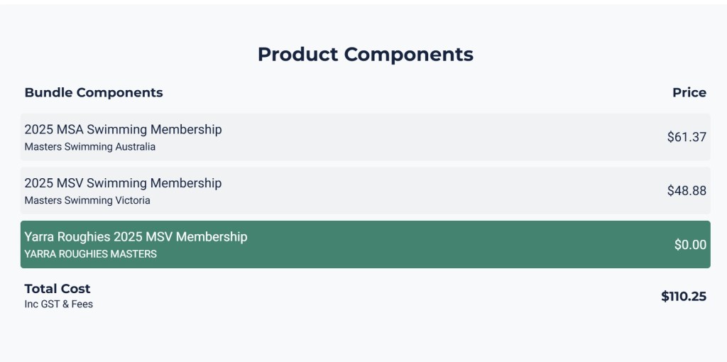 2025 Masters Swimming Victoria Membership is $110.25, which includes both the MSV and MSA membership components, which are set by MSV and MSA respectively.